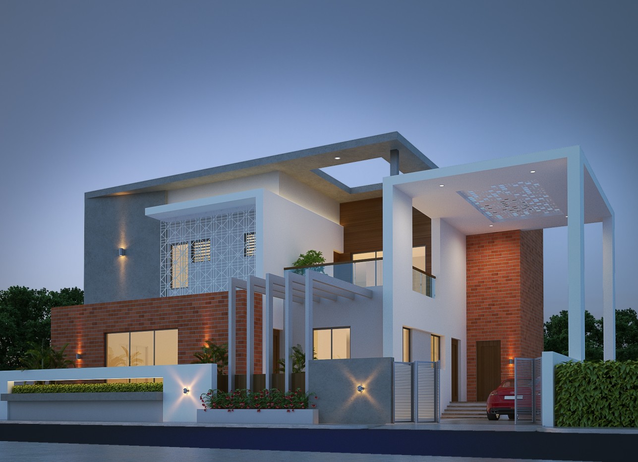 A contemporary façade brought to life with clean lines, warm textures, and a balanced material palet...